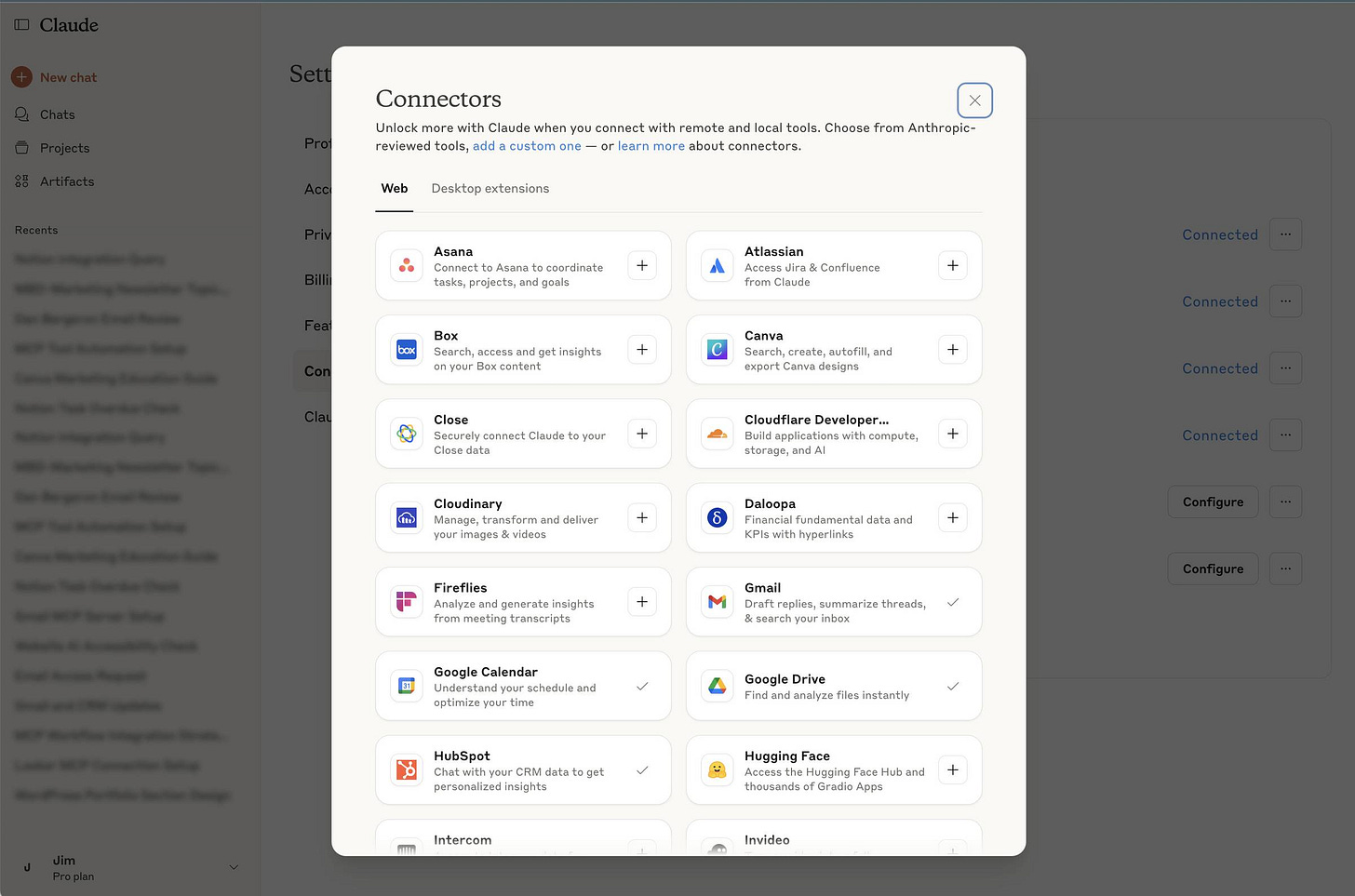 These MCP connections are available on the Claude Pro plan ($20/mo). Now I'm watching videos and reading articles to think of other ways I can automate my business. The work will always be the work, and that's the fun part for me, so it's unlikely I'll try to automate any of that.